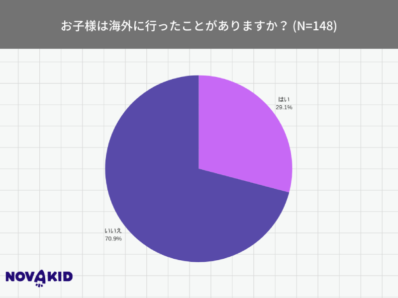世界約52ヶ国で子ども向けオンライン英会話を提供するNovakidは、4〜12歳の子どもを持つ日本在住の保護者150人を対象に「海外旅行の意識調査」を実施した。まず、「お子様は海外に行ったことがありますか?」(n=148)と質問をしたところ、約3割が「はい(29.1%)」と回答。