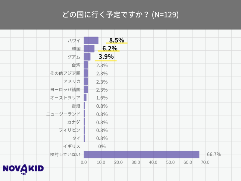 また、調査実施時(2024年7月)の「今年の夏休み、海外旅行を検討していますか?」(n=146)という質問に「はい(16.4%)」と回答した保護者に、「どの国にいく予定ですか?」(n=129)とたずねると、「ハワイ(8.5%)」が最も多く、「韓国(6.2%)」「グアム(3.9%)」と続いた。