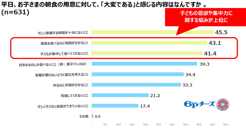 子どもの朝食の用意に対して大変だと感じている理由には、多いものから「忙しく準備する時間が十分にない(45.5%)」「子どもが朝食を食べるのに時間がかかる(43.1%)」「子どもが集中して食べてくれない(41.4%)」と続き、わが子の朝ごはんを食べる意欲や集中力に関する悩みが多いことがわかる。