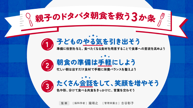 子育てファミリーの平日の朝ごはんに関する悩みを解決するため、脳科学者の瀧靖之さん・管理栄養士の古谷彰子さん監修のもと制定されたのが、「親子のドタバタ朝食を救う3か条」だ。