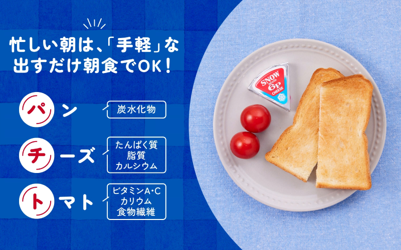 忙しい朝は“出すだけ食材”を活用する、という方法。とはいえ、先ほどの調査結果のように、パンだけの朝食では栄養面が気になる。朝ごはんでは「何を」「どれだけ」準備できればいいのか、その指標となるのが、パン・チーズ・トマトの組み合わせ「パチト」だ。