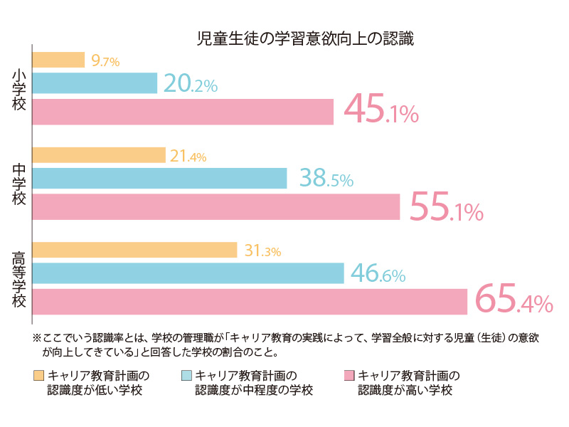 実際、国立教育政策研究所の調べでは、キャリア教育によって「不得意なことも進んで取り組もうとする」「相手の意見を聞き、理解しようとする」「学ぶことや働くことの意義を理解し、自分の将来につなげて考える」といった結果が得られ、キャリア教育への取り組みに積極的であればあるほど学習意欲が向上するという。