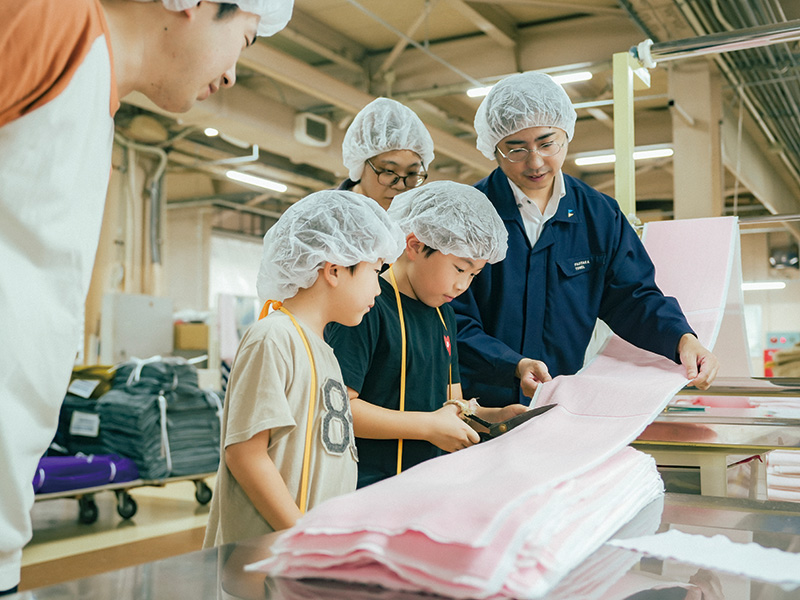 日本で使われているタオルの8割以上が輸入される中、今治タオルのブランディング化に成功。子どもたちはタオル工場を見学し、タオルカットと半自動ヘム縫い、パッケージを体験した。