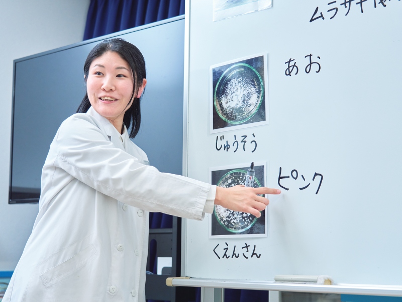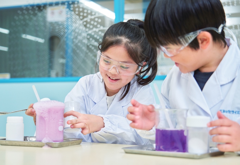 自分たちで考え、「こうかな?」と仮説を立てる。2人で話し合うと、アイデアもたくさん出てきた! 「他の液体でもやってみよう!」「ムラサキキャベツ液だから泡が出るのかな?」
