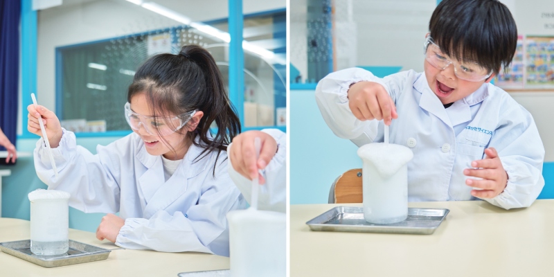「クリームみたい!」「他の液体でも泡が出るんだ!」「凍らせたらどうなるのかな?」
