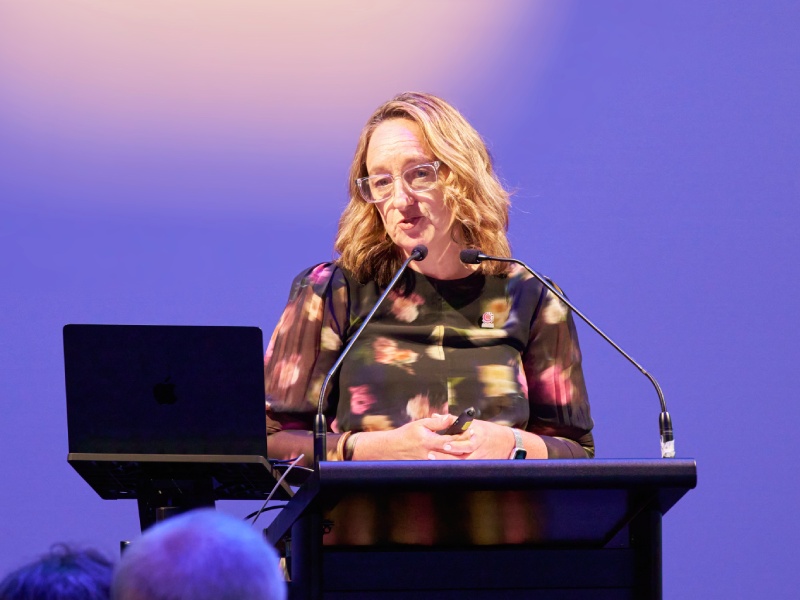 大森教授に続いては、シェパードセンターのCEO アリーシャ・デイビス博士が登壇。オーストラリアの聴覚障害者支援システムについて詳しく説明した。