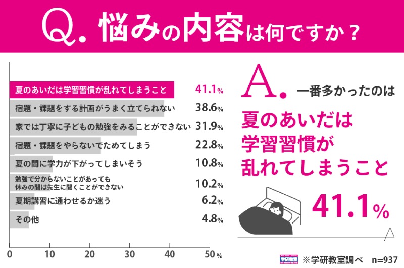悩みの内容は、「夏のあいだは学習習慣が乱れてしまう(41.1%)」「宿題・課題をする計画がうまく立てられない(38.6%)」が特に多いようだ。