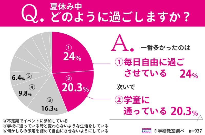 「夏休み中はどのように過ごしますか?」の質問では、「毎日自由に過ごさせている(24.0%)」「学童に通っている(20.3%)」の回答がともに2割で最多となった。