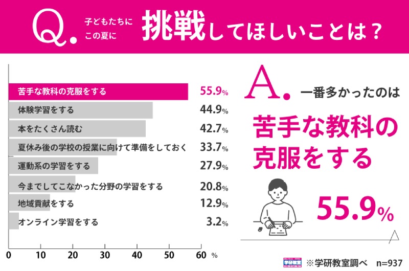 また、「子どもたちにこの夏挑戦してほしいことは?」の質問で一番多かったのは、「苦手な教科の克服をしてほしい(55.9%)」が約6割、続いて「体験学習をする(44.9%)」「本をたくさん読む(42.7%)」が約4割となった。