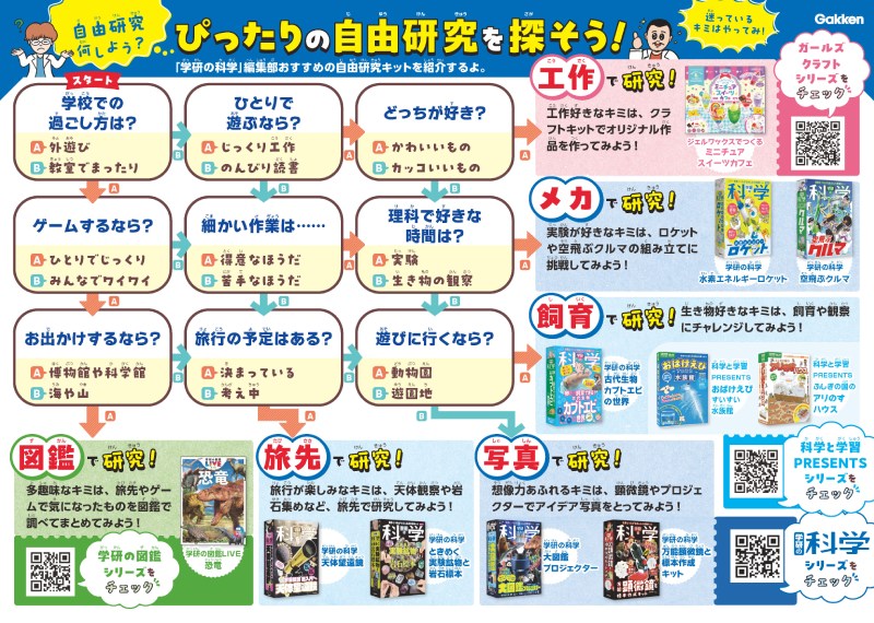 それぞれ面白そうではあるけれど、わが子には実際どんな自由研究が向いているのかも、気になるところ。会場で展示されていた、「どんな自由研究が向いてるかのマップ」が参考になる。