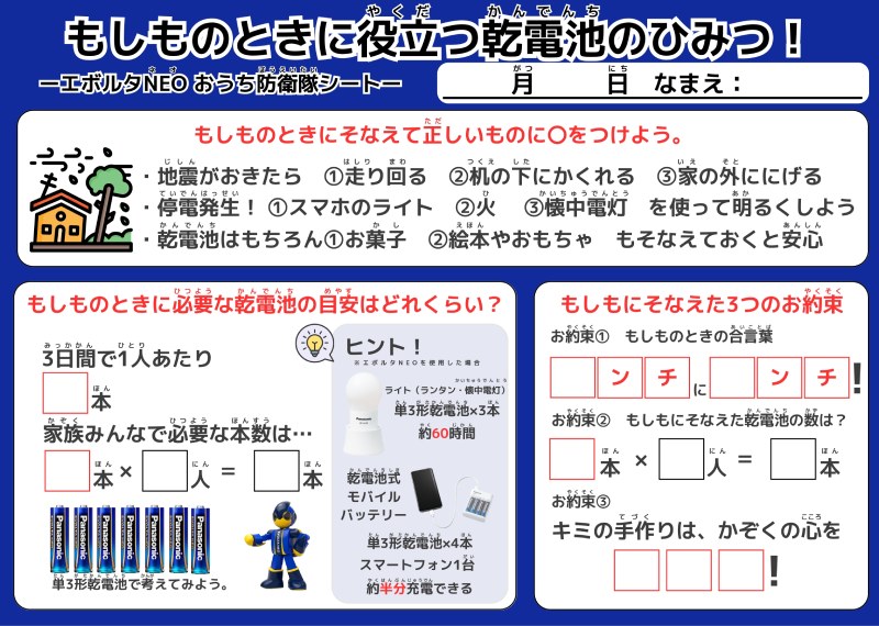 「もしもの時に、必要な乾電池はどのくらい?」という問いでは、目安として「3日間で1人あたり17本の乾電池が必要」※と紹介され、「これはあくまで1つの目安。大切なのは、“何が必要か”を家族で話し合うこと」と伝えられた。