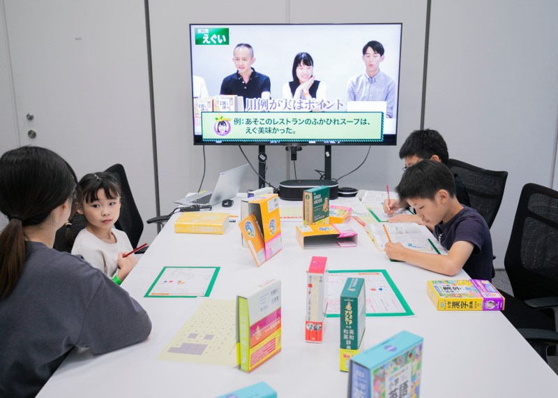 学研辞典編集部が実施していた、国語辞典で言葉を調べながら自分を1ページで説明する、というワークショップ。自分についてじっくり考え、さまざまな辞典をめくりながら、自分らしい言葉や自己紹介に使いたい言葉を探したり、映像での言葉についての解説や専用ワークシートを参考に、一生懸命に取り組む子どもたちの姿が印象的だった。