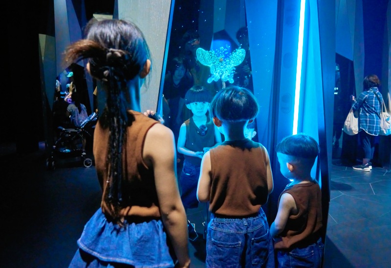 パパ:「高輝度プロジェクターを使って、滝に蝶々が映し出されているんだって」