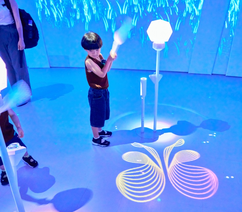 解き放たれた感性が、つながる世界に作用していくZONE4『大空へ』は、360°の空間に映像が映し出されるイマーシブシアター。体験者がそれぞれの結晶デバイスを指定の場所にかざし、「葉っぱ=うちわのようなデバイス」を持って風を起こすと、床面に蝶が生まれ、大空へ羽ばたきながらさまざまな音を奏でる。