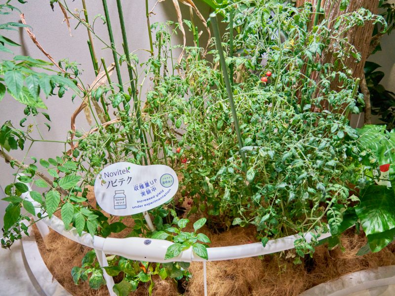 みつ:「ボクは、トマトを育てているところ! バクテリアでトマトを育てると、トマトがたくさん育つんだって」(展示スペース:シアノバクテリアがCO2を吸収して生成する液体成長刺激剤「Novitek(ノビテク)」を農作物の葉っぱに吹きかけると、農作物がぐんぐん成長、農作物の収穫量やサイズがアップ。トマトは最大44%増の収穫に)