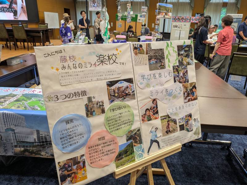 学校紹介ブースでは、各校がパンフレットや展示などを使って、それぞれの学校の特徴を参加者に説明していた。「子どもの主体性や多様性を尊重する」という方針は共通しているが、具体的な教育プログラムや、教育環境などはスクールごとにさまざまな個性がある。