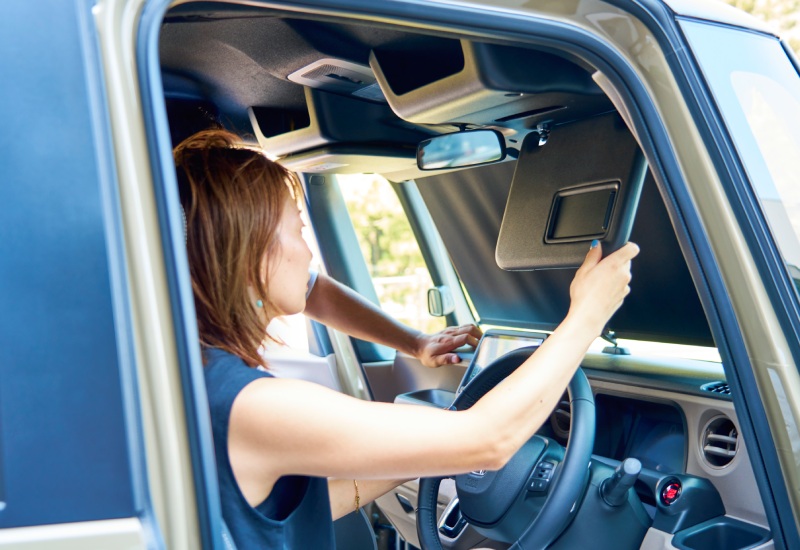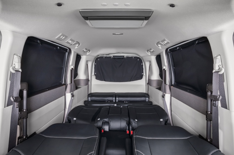 アウトドアでの着替えは、プライバシーの確保が必須。ウィンドウ全体を覆い目隠しができる「プライバシーシェード」を装着すれば、駐車場などでも着替えが可能だ。装着した時のスマートな室内空間は、純正アクセサリーならではのデザイン。