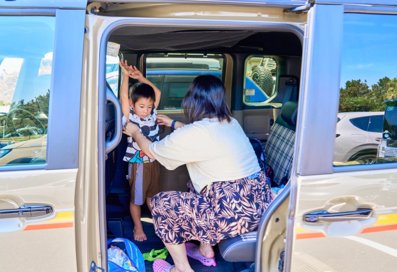 楽しい磯遊びが終了したら、シャワーを浴びて着替えへGO! 子どもたちはHonda車を着替えスペースとして活用した。