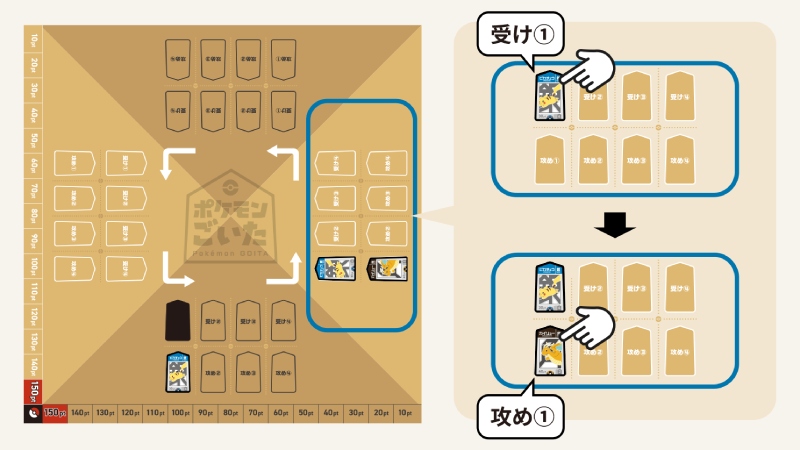 「受け」とは、前の人が出した「攻め」と同じポケモンのコマを出すこと。同じコマを持っていなければ「なし」と宣言して次の人へ。