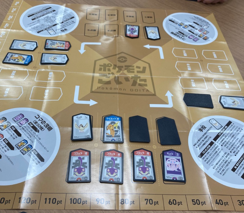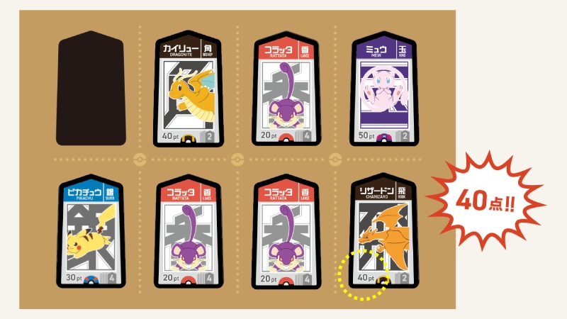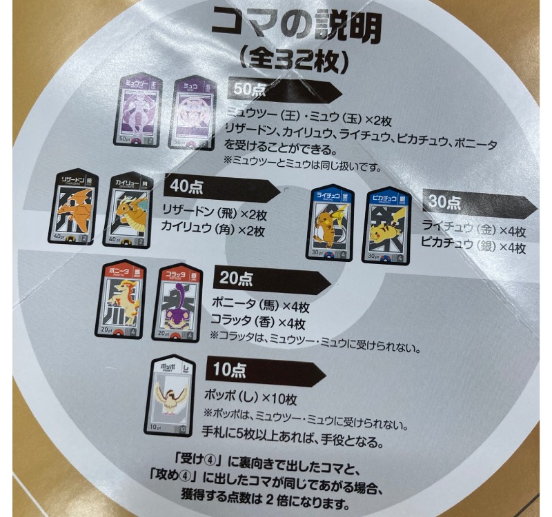 コマは全部で8種類(「ミュウツー(王)」と「ミュウ(玉)」は同じ扱い)。151匹のポケモンの中から役と特徴に合わせてセレクトされており、コマによって枚数と点数が異なるので、誰が何を何枚持っているか、次は何を出すか・残すか、という読みと戦略が面白い。