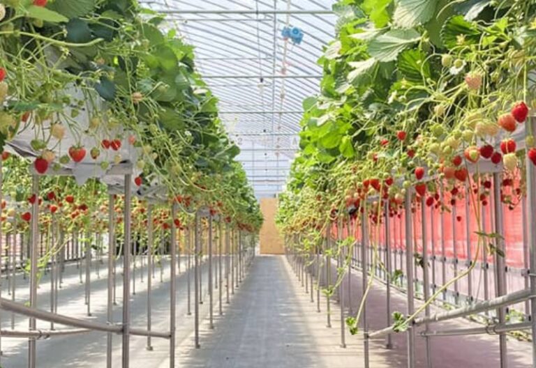 横浜市戸塚区にあるいちご狩り施設。ワイヤーで吊るした栽培棚で、通路も広くバリアフリー対応しているので、車椅子やベビーカーでも快適に利用できる。