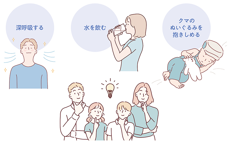 怒りをやりすごすコーピングの方法は、一般的には「5~10秒数えるといい」などと言われるが、何秒我慢すれば絶対落ち着けるということではない。かかる時間は子どもの性格や状況によってさまざまで、やりやすい方法もいろいろ。「水を飲む」「深呼吸する」「布団にくるまる」「部屋の隅っこに行く」など、その子ならではの落ち着き方を見つけてあげることが大切だ。